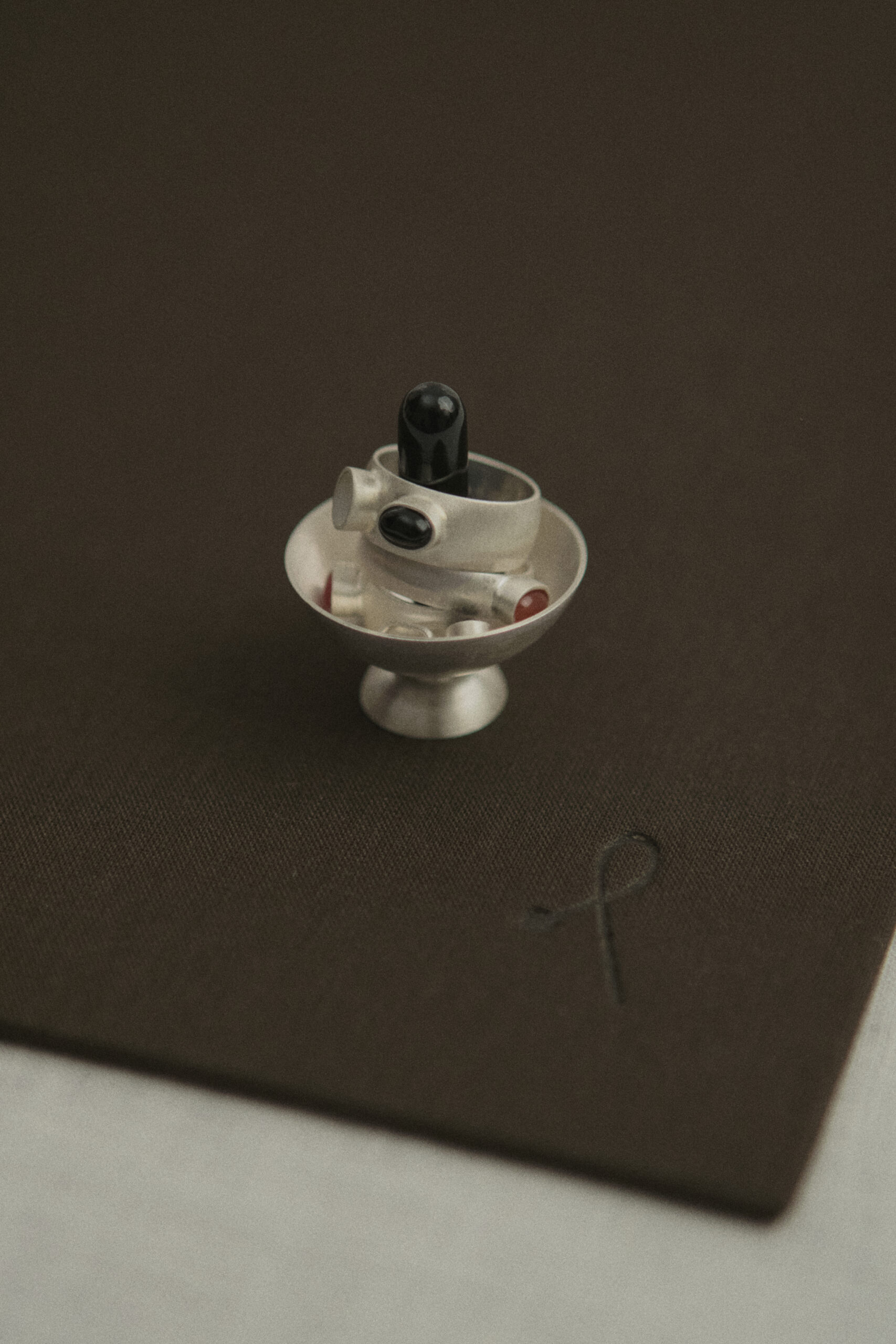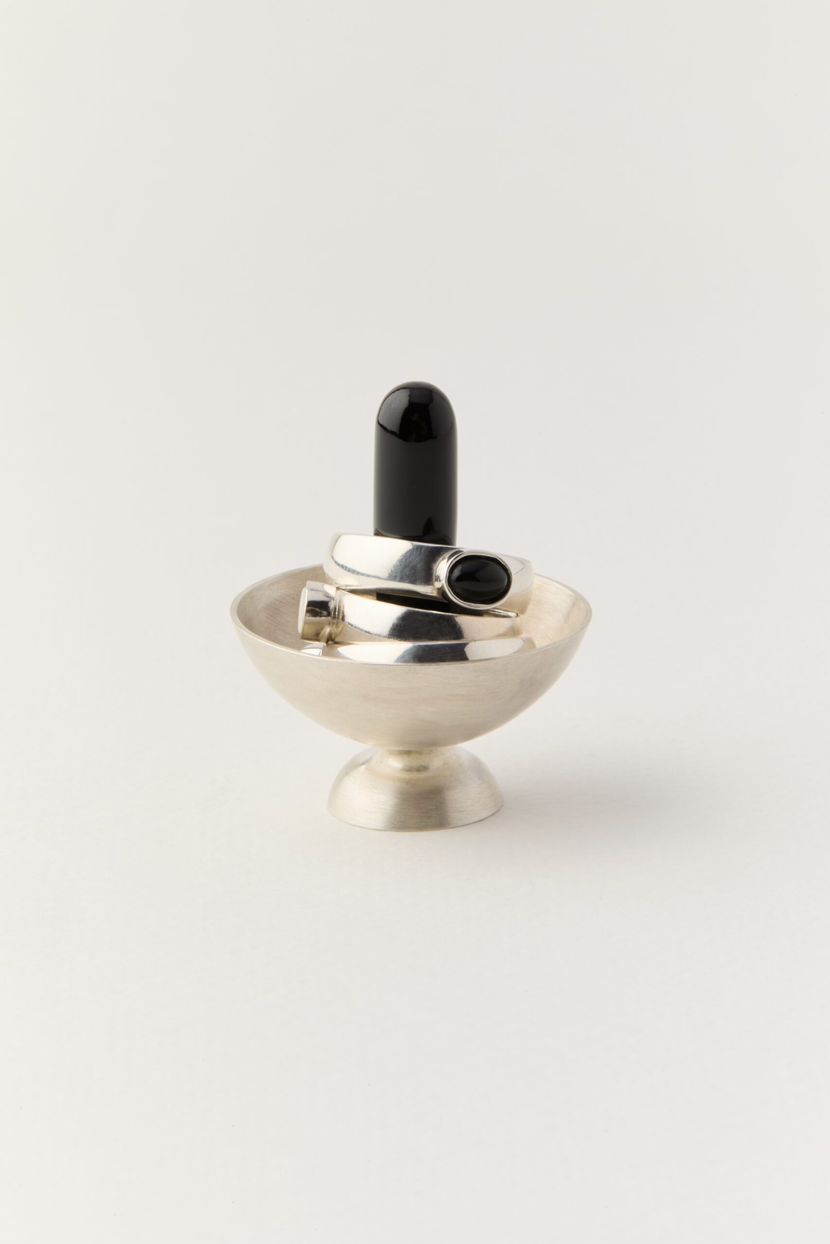 wykonany w całości ręcznie ze srebra stożek na biżuterię, zwieńczony ozdobnym soplem onyksu stanowi subtelne połączenie funkcji użytkowej z rzeźbiarską formą