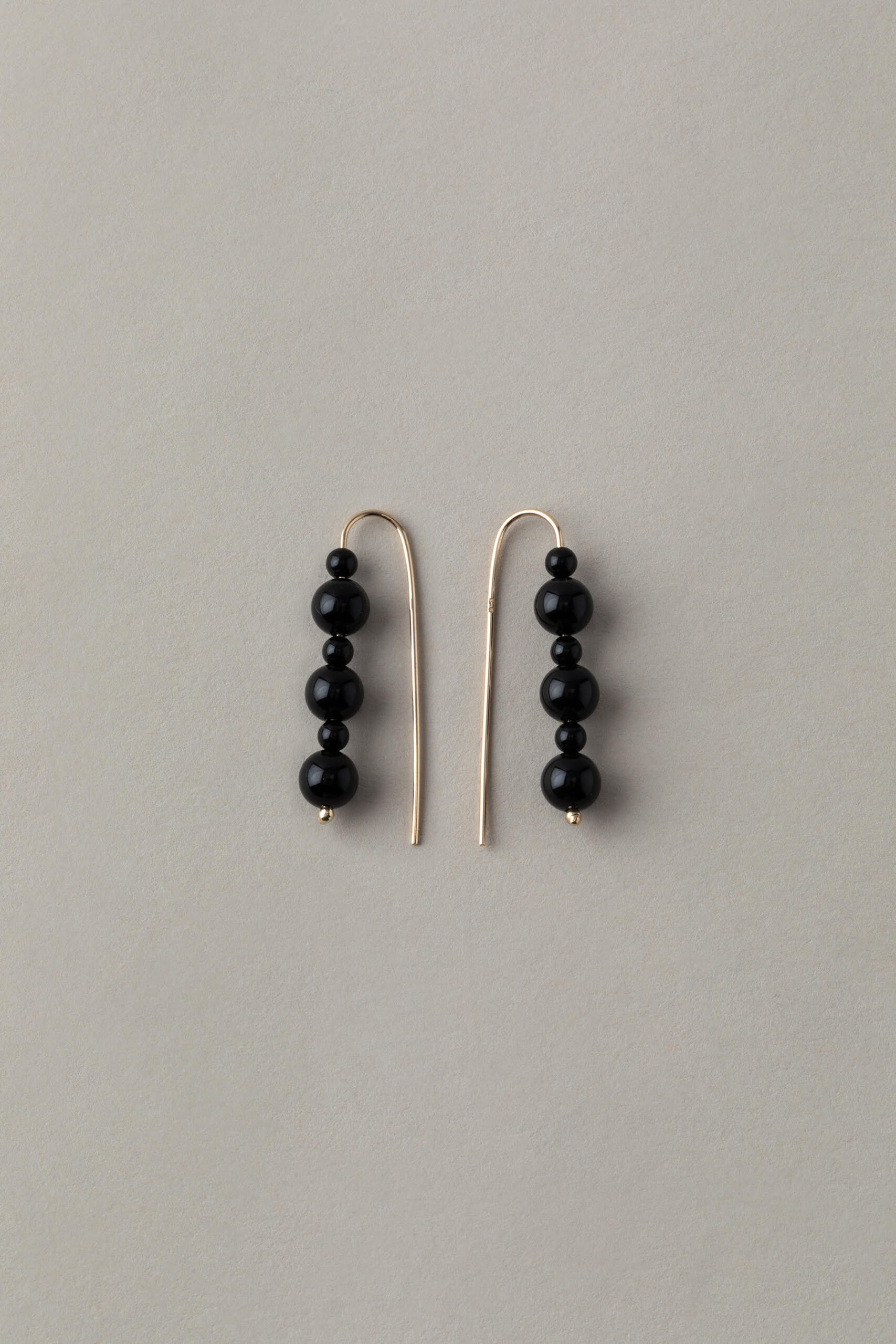 wykonane ręcznie ze złota próby 585 kolczyki z przeplatającymi się kulami onyksu w dwóch rozmiarach subtelnie się przenikają, tworząc harmonijną i elegancką kompozycję. Głęboka i aksamitna czerń kamienia nadaje kolczykom szlachetnego charakteru i sprawia, że doskonale podkreślają zarówno codzienne, jak i wieczorowe styliazacje.