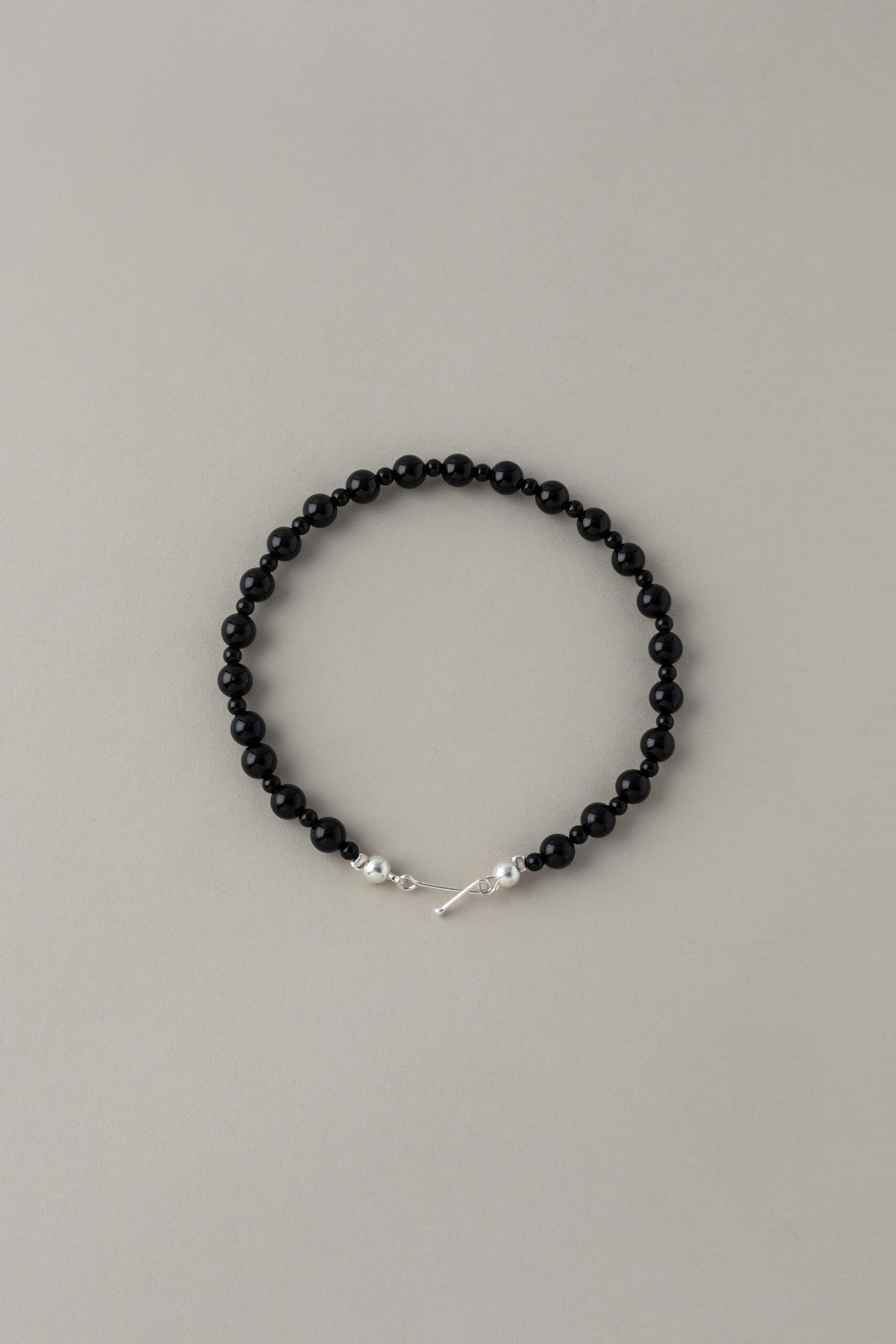 elegancka bransoletka na kostkę wykonana z przeplatającyh się ze sobą kul onyksu w dwóch rozmiarach wykończona srebrnym zapięciem nawiązującym do loga projektantki