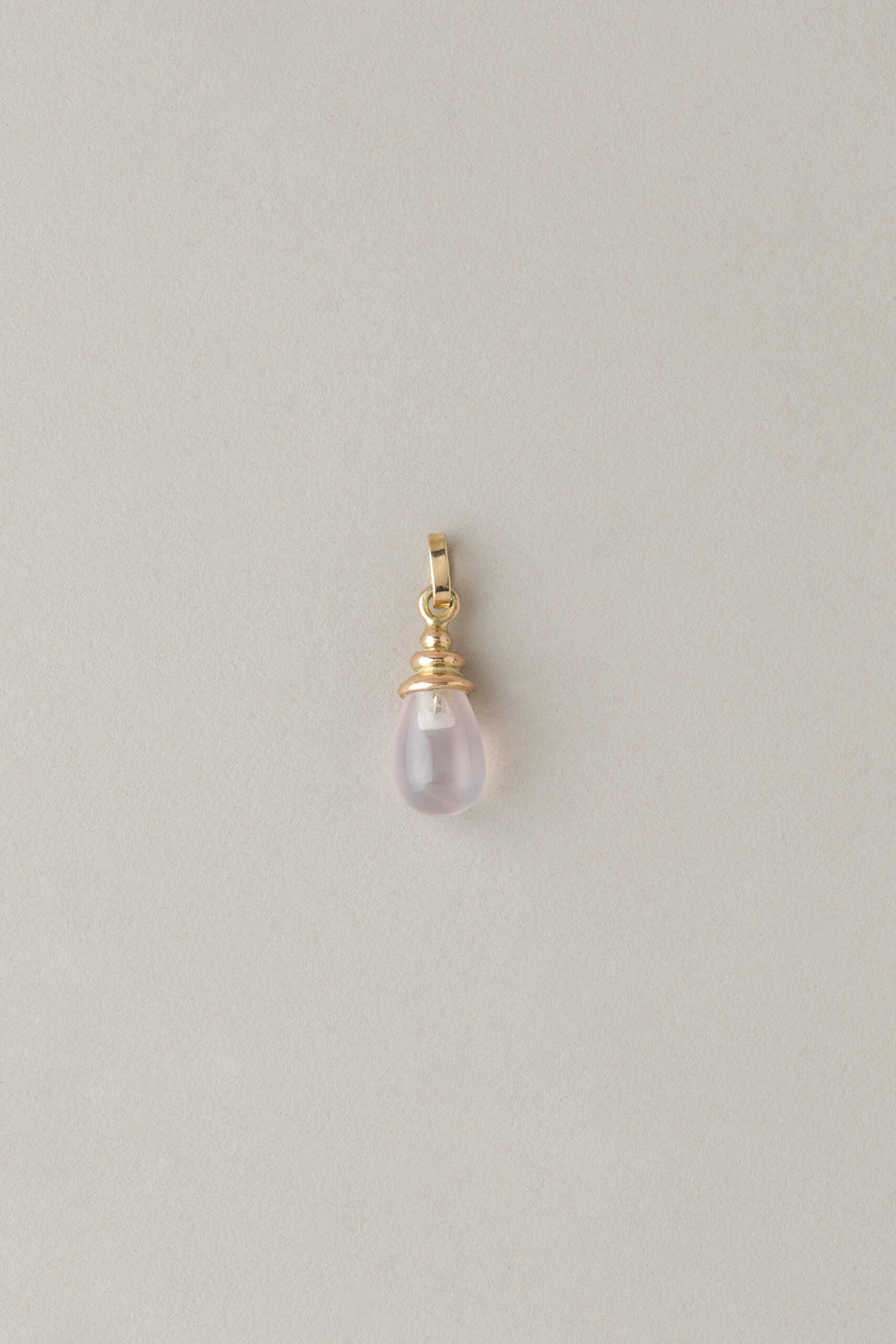 zawieszka o rzeźbiarskim charakterze, w której elegancka plisowana oprawka otula wykonany na zamówienie pod autorski wzór sopel różowego kwarcu o delikatnym, pudrowym odcieniu
