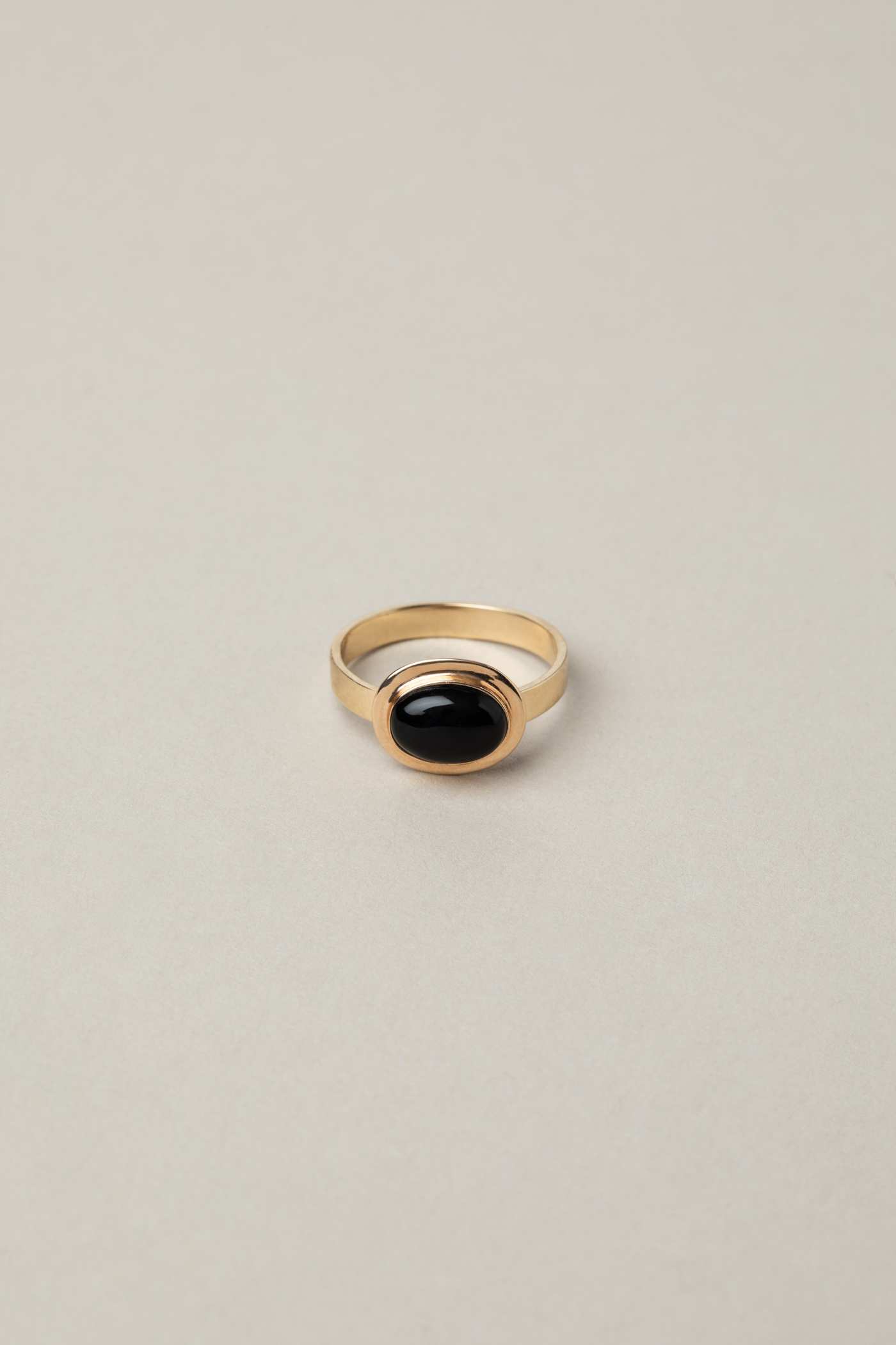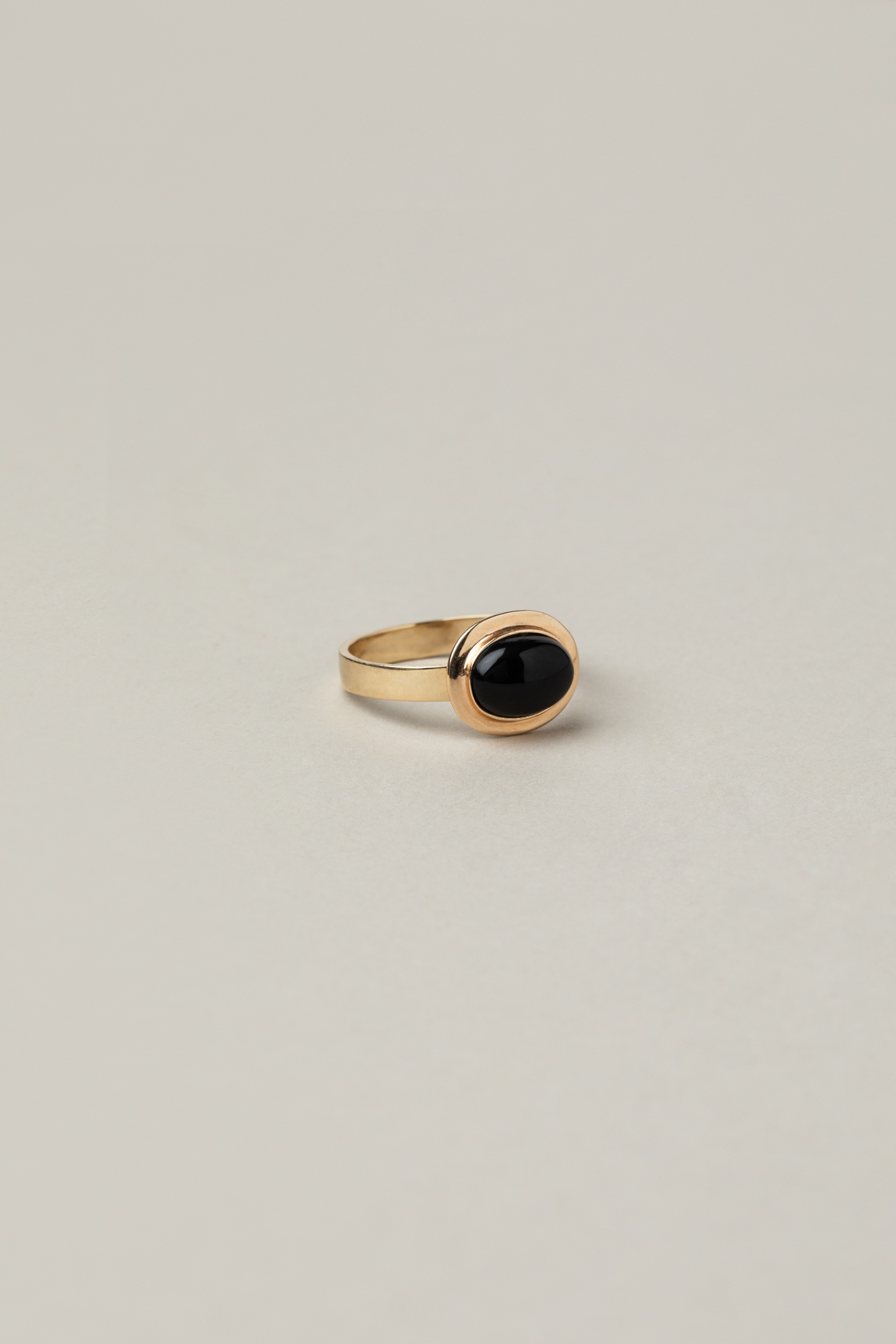 ręcznie wykonany pierścionek ze złota 585, wyróżniający się starannie oprawionym oczkiem wypełnionym onyksem