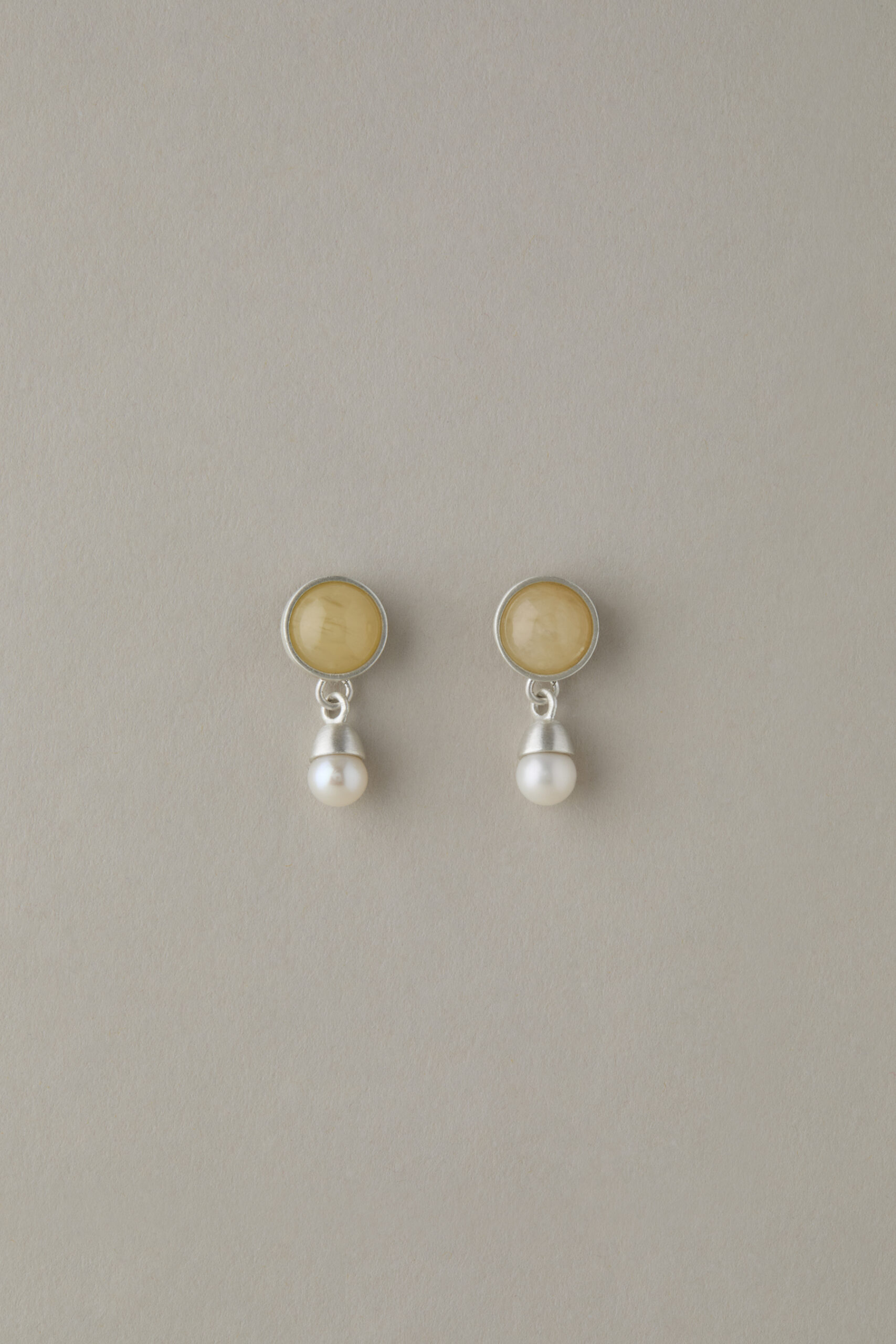 wykonane ręcznie ze srebra 925 eleganckie kolczyki składające się z dwóch segmentów – oczka wypełnionego naturalnym kamieniem i dzwoneczka z naturalną perłą
