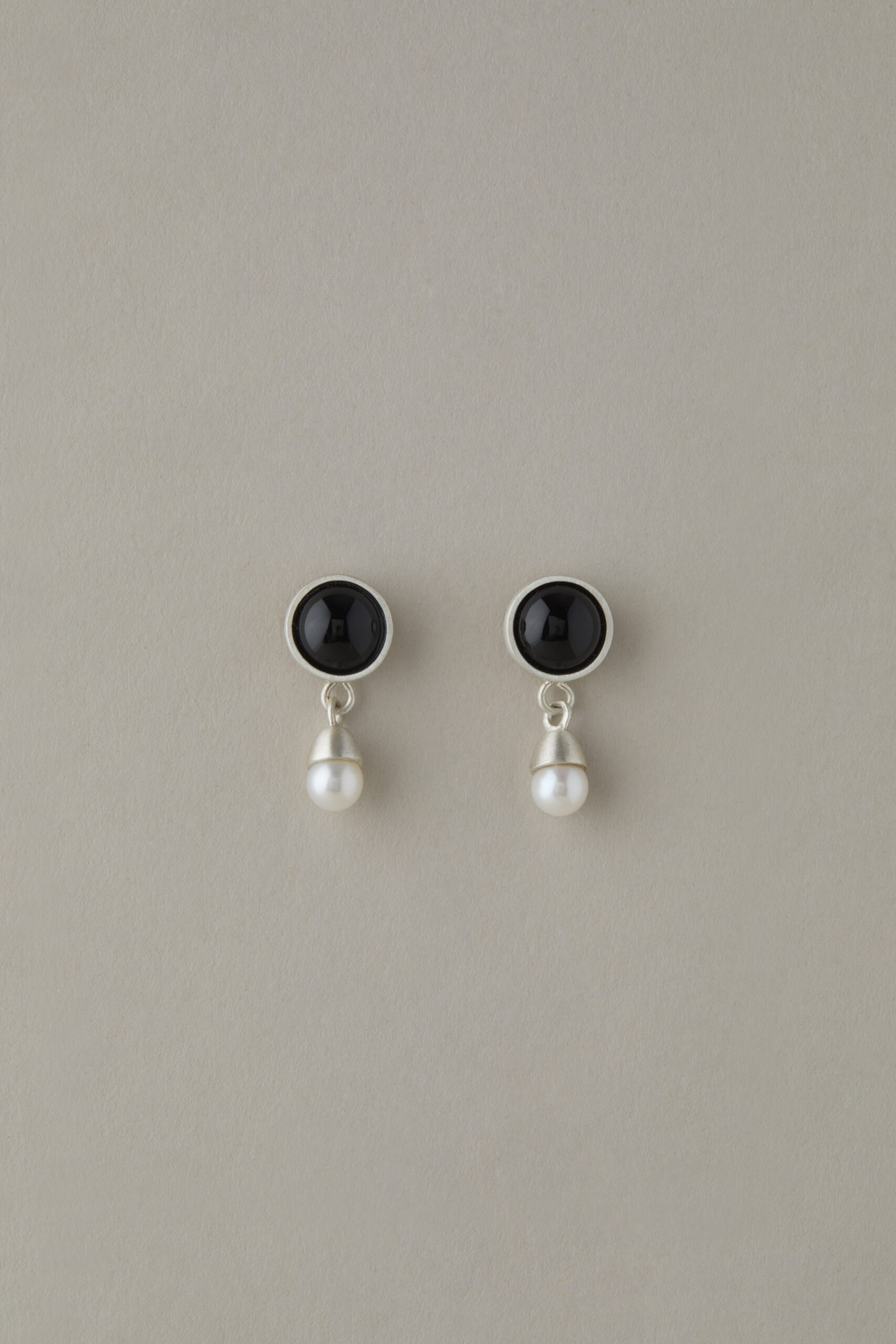 wykonane ręcznie ze srebra 925 eleganckie kolczyki składające się z dwóch segmentów – oczka wypełnionego naturalnym kamieniem i dzwoneczka z naturalną perłą