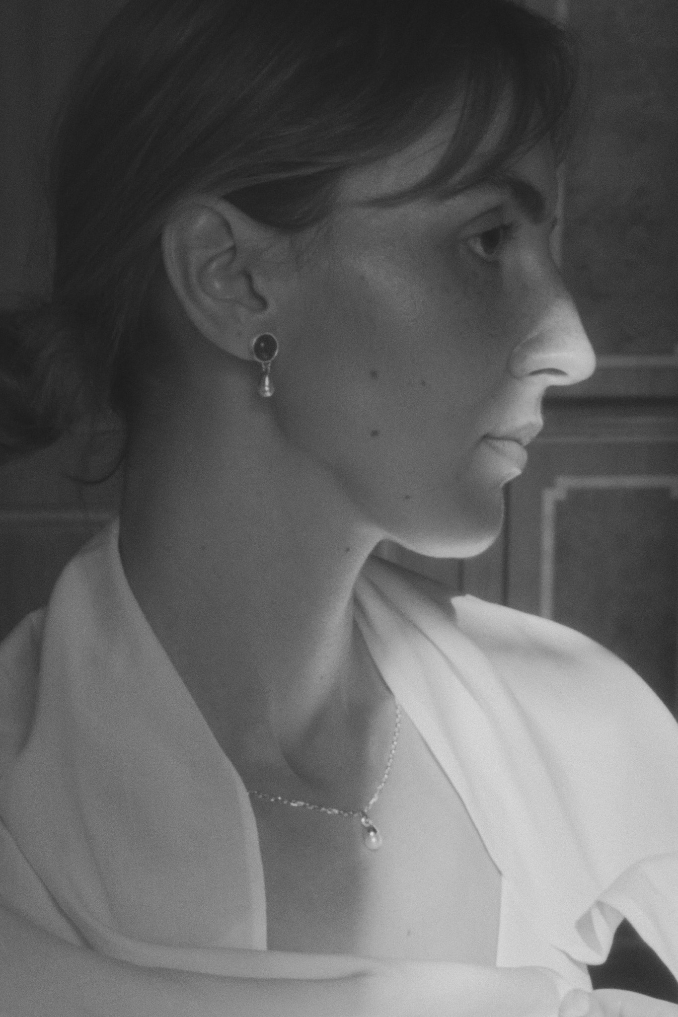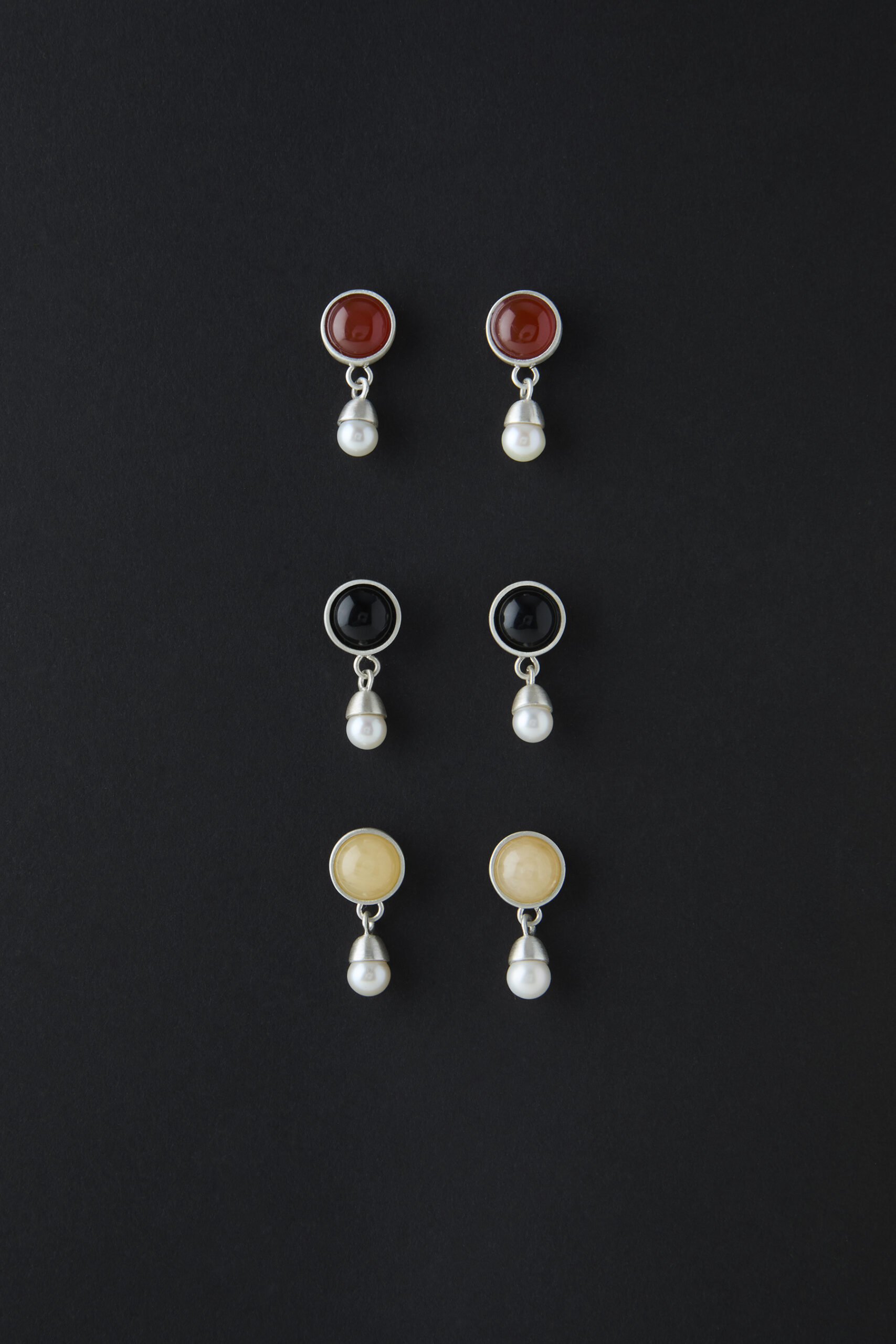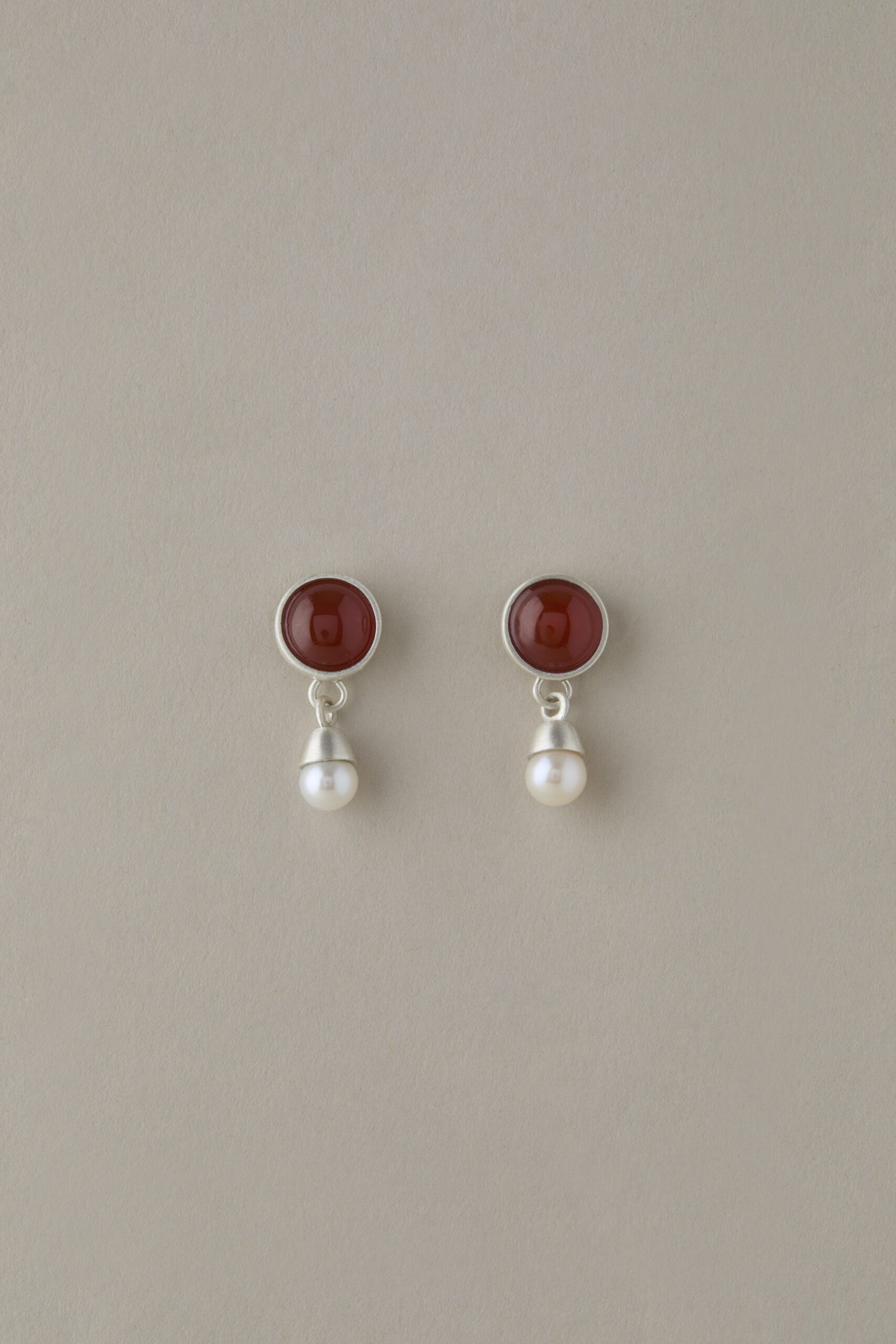 wykonane ręcznie ze srebra 925 eleganckie kolczyki składające się z dwóch harmonijnie połączonych segmentów – oczka wypełnionego naturalnym kamieniem – karneolem o pięknym, ciepłym kolorze herbaty z sokiem malinowym i dekoracyjnym dzwoneczkiem z naturalną perłą